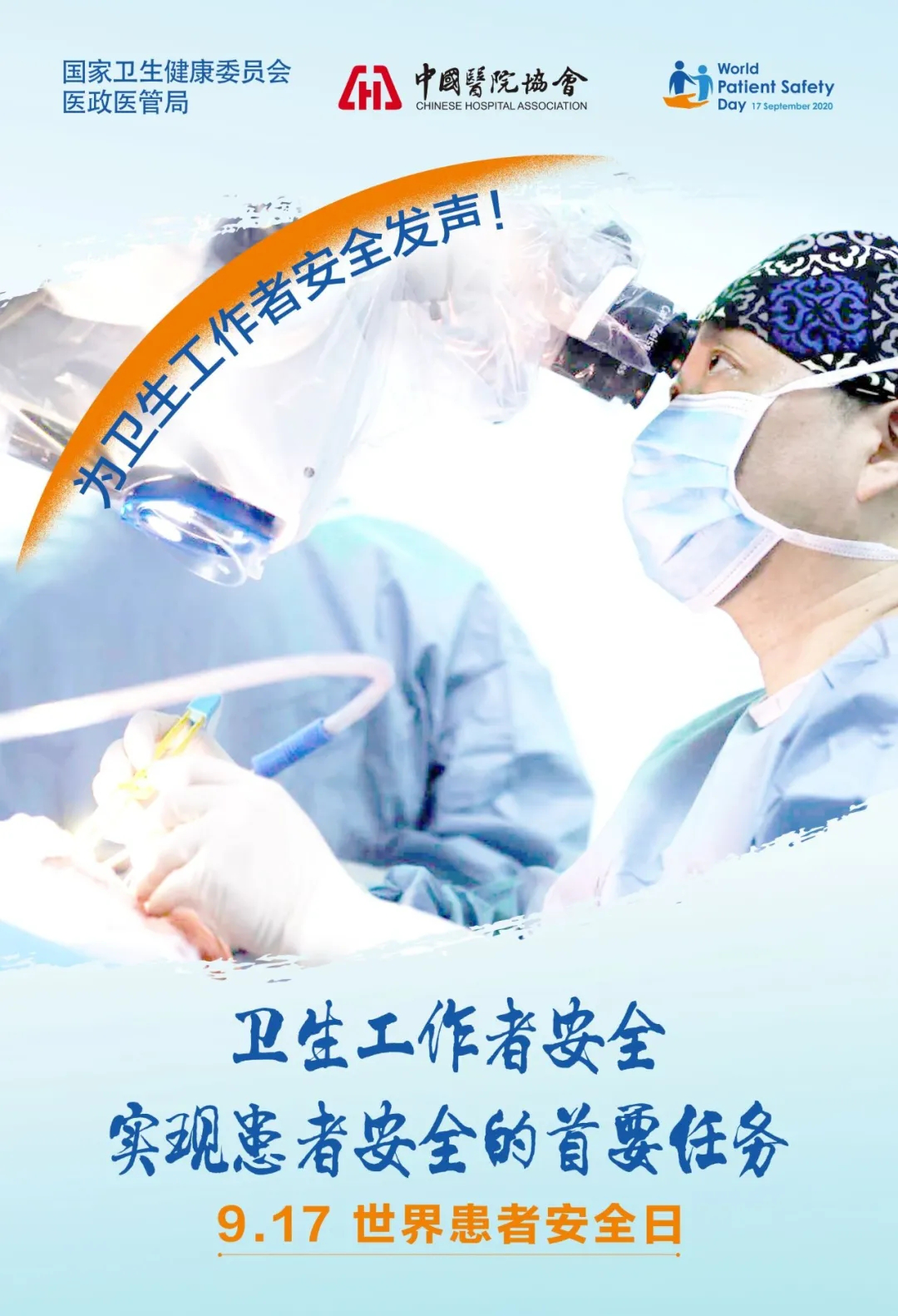 为响应世界卫生组织2020世界患者安全日(9月17日)活动,在医疗机构中营造积极向上的患者安全文化氛围,在国家卫生健康委医政医管局的指导下,中国医院协会组织开展第二个世界患者安全日主题公益宣传活动。本次活动主题为“卫生工作者安全:实现患者安全的首要任务”,口号是“卫生工作者安全,患者就安全”,行动呼吁“为卫生工作者安全发声!”