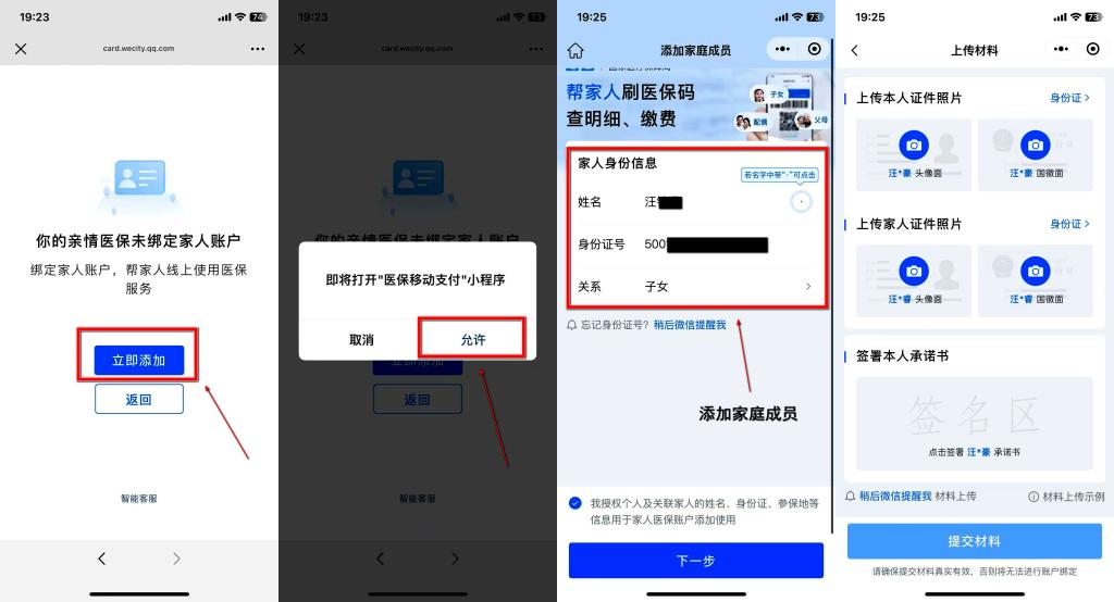如尚未绑定就诊人的医保亲情账户,系统将自动提示您进入添加流程。请按指引上传挂号操作人及就诊人的证件照片,在线签署承诺书,并完成就诊人的人脸识别验证,即可成功授权并使用医保支付。